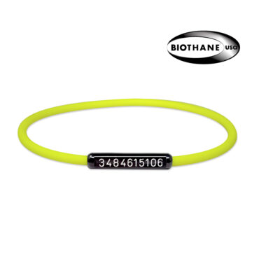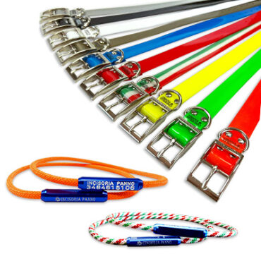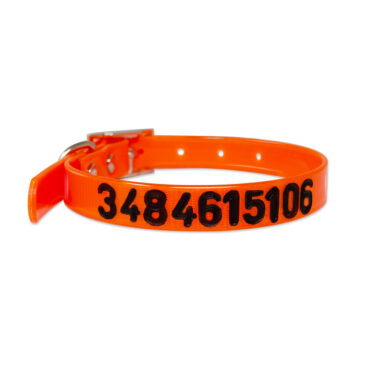 Collare in alta visibilità personalizzato con un incisione particolare in modo da riuscire a far visualizzare il numero telefonico nel poco spazio disponibile.